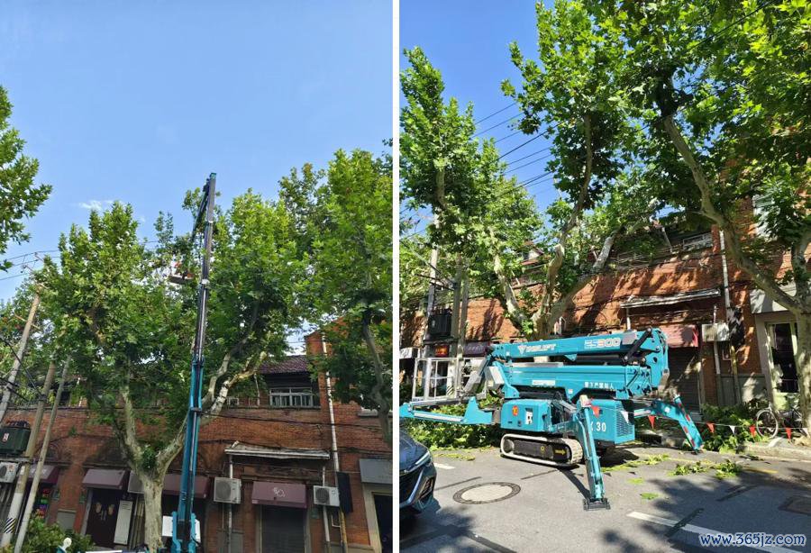此外,先进机械的援助,也能开释养护队列的活力。最近,开国西路(瑞金二路至陕西南路)上迎来一只“蜘蛛”——蜘蛛式高空功课车,养护员站在吊臂尖端的吊篮内,轻松来到十几米高空,无谓将元气心灵漫步到保管体格均衡上,汇注元气心灵修剪树冠顶部枝条。